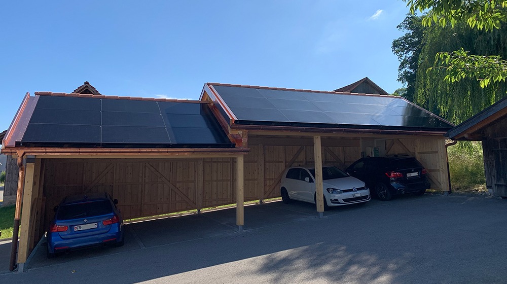 Installation solaire Megasol Nicer 3 – 7.80 kWc en intégration sur couvert à voiture à Arconciel.